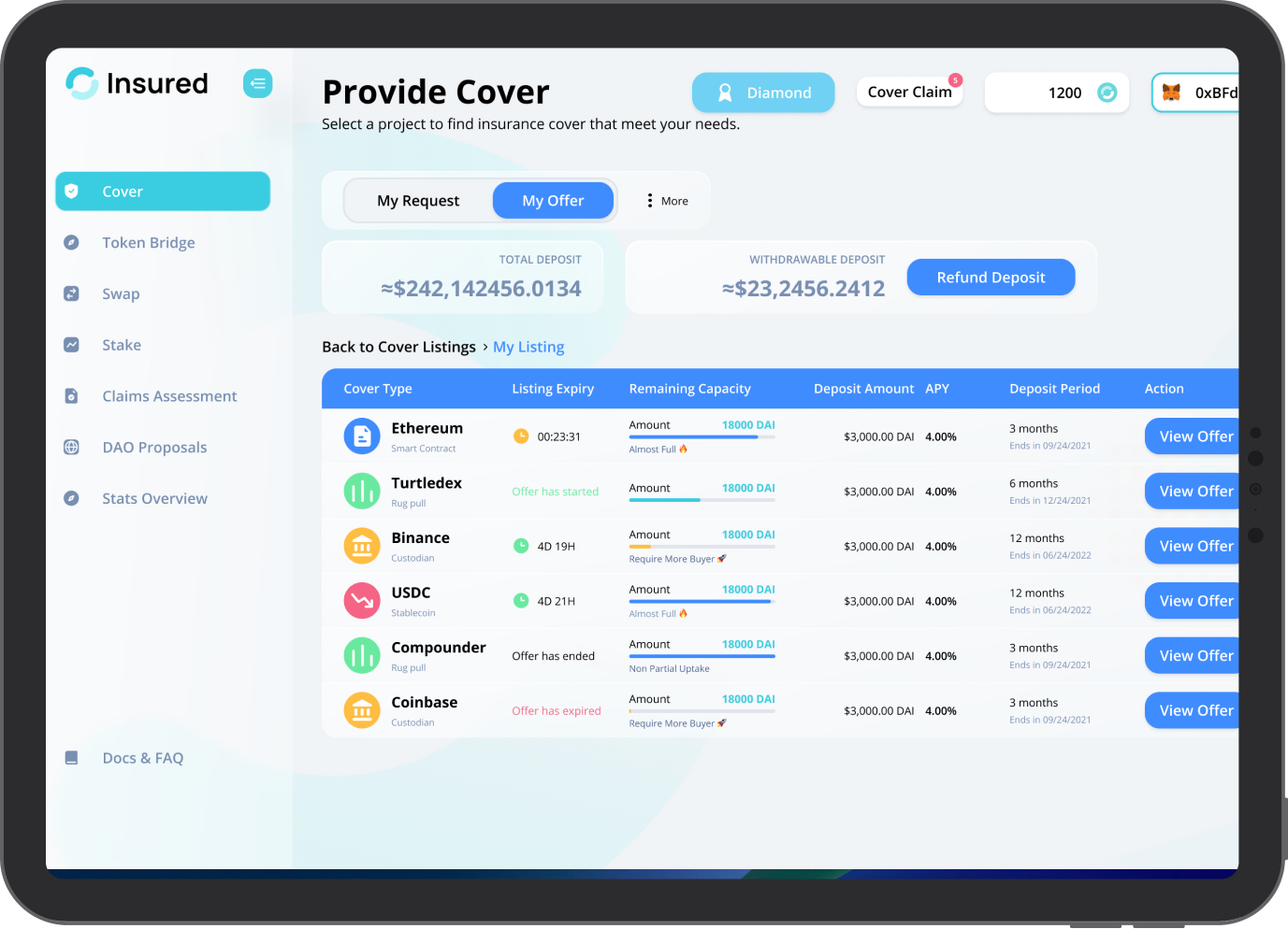 On the Insured Finance platform, people can insure their assets on exchanges, within smart contracts, or in stable tokens, all without the need for an intermediary.