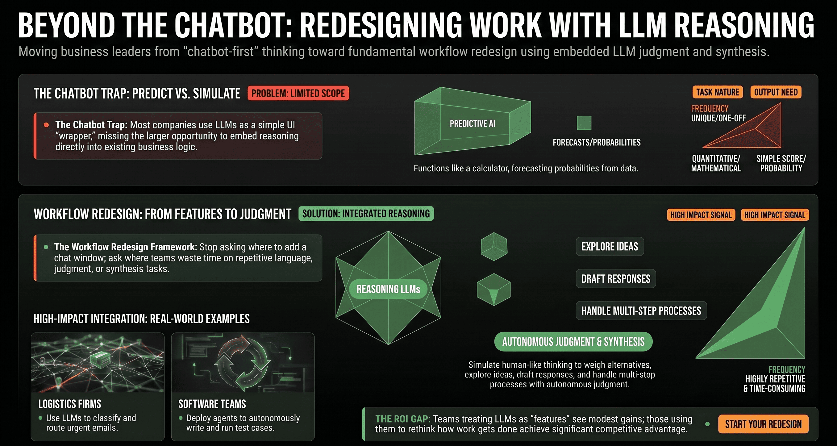LLMs are not just smarter search engines or fancy chatbots. They are the first technology that can simulate human-like reasoning at scale for language-based work. The companies that will win with LLMs are those that stop thinking in terms of "AI features" and start thinking in terms of process transformation.