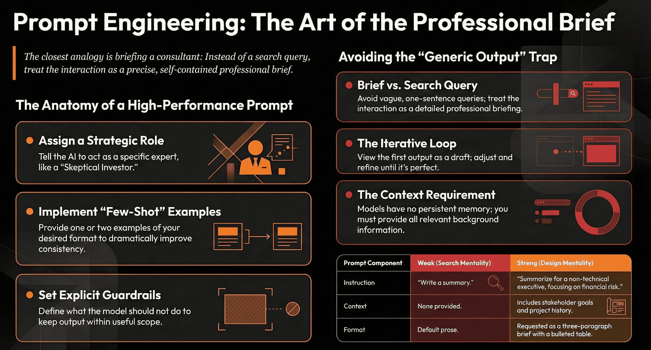 A related issue is not iterating. Prompt engineering is, in practice, a loop. You write a prompt, you evaluate the output, you adjust the prompt based on what was off, and you try again. Treating the first output as final unless it happens to be exactly right is leaving most of the value on the table.